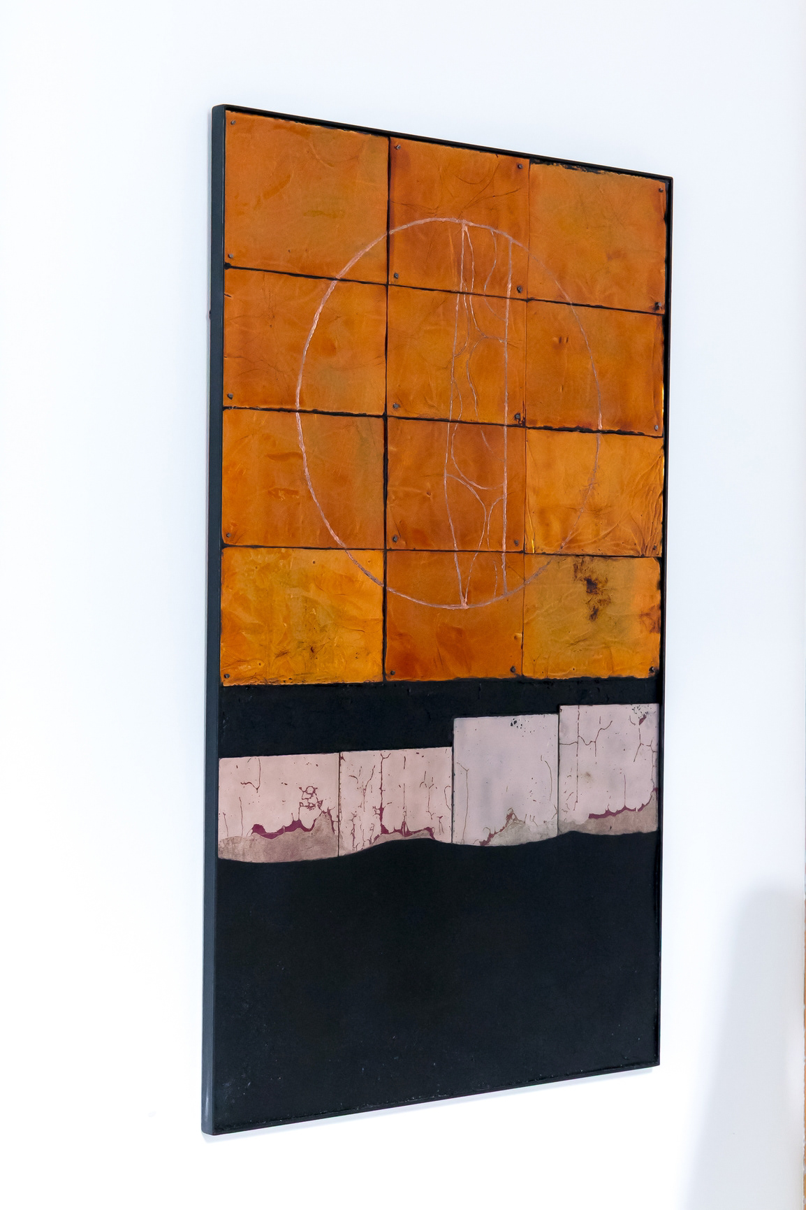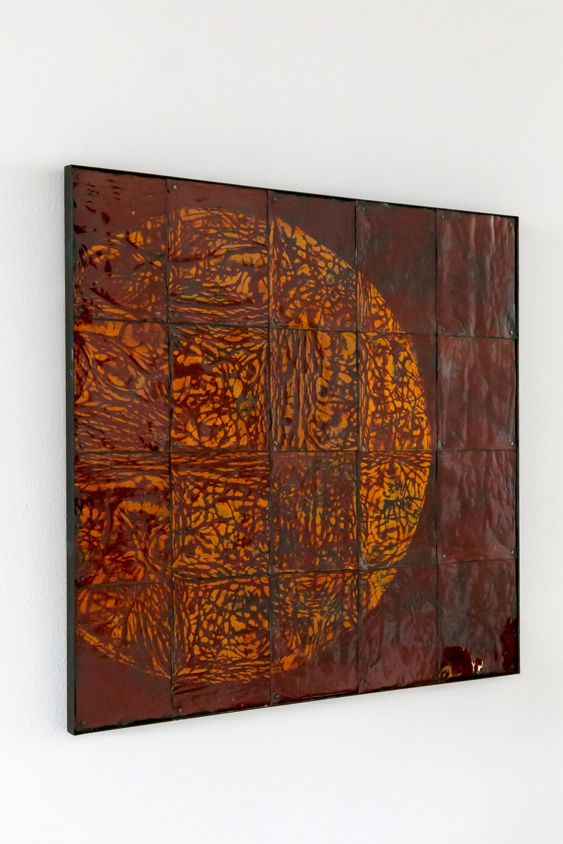 Christophe Mirande s’approprie l’émail d’orfèvre et en révèle la lumière et la profondeur. Sa série Les froissées, constituée de très fines feuilles de cuivre émaillées, géométriques et vibrantes, rappelle l’éclat du feu et invite à une contemplation presque sacrée.