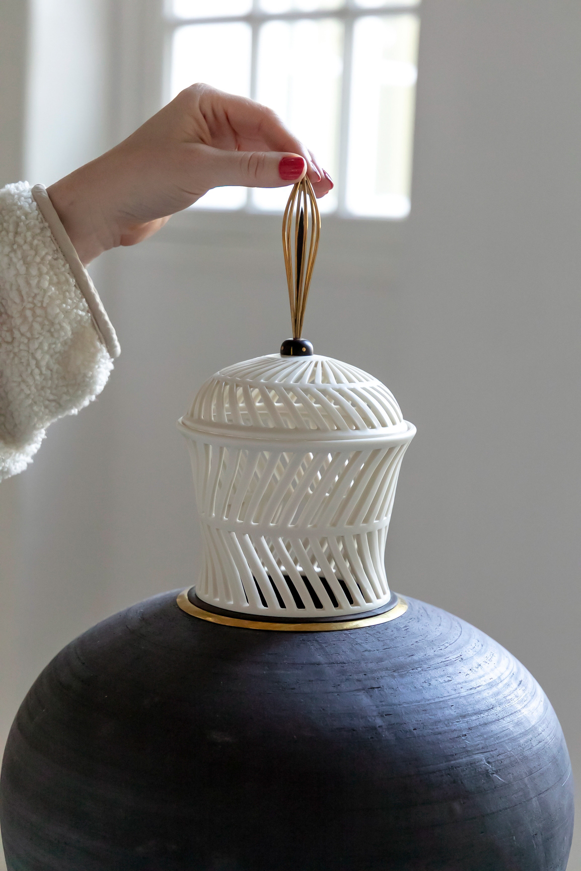 La potiche, poterie d’extrême orient aujourd’hui peu répandue en Europe, bien que magnifiquement complexe et fondamentalement inutile, est son sujet de prédilection actuel. L’absence de contrainte utilitaire en fait un objet de découverte et d’expérimentation infini, qu’elle s’approprie en apportant sa touche résolument personnelle et contemporaine.