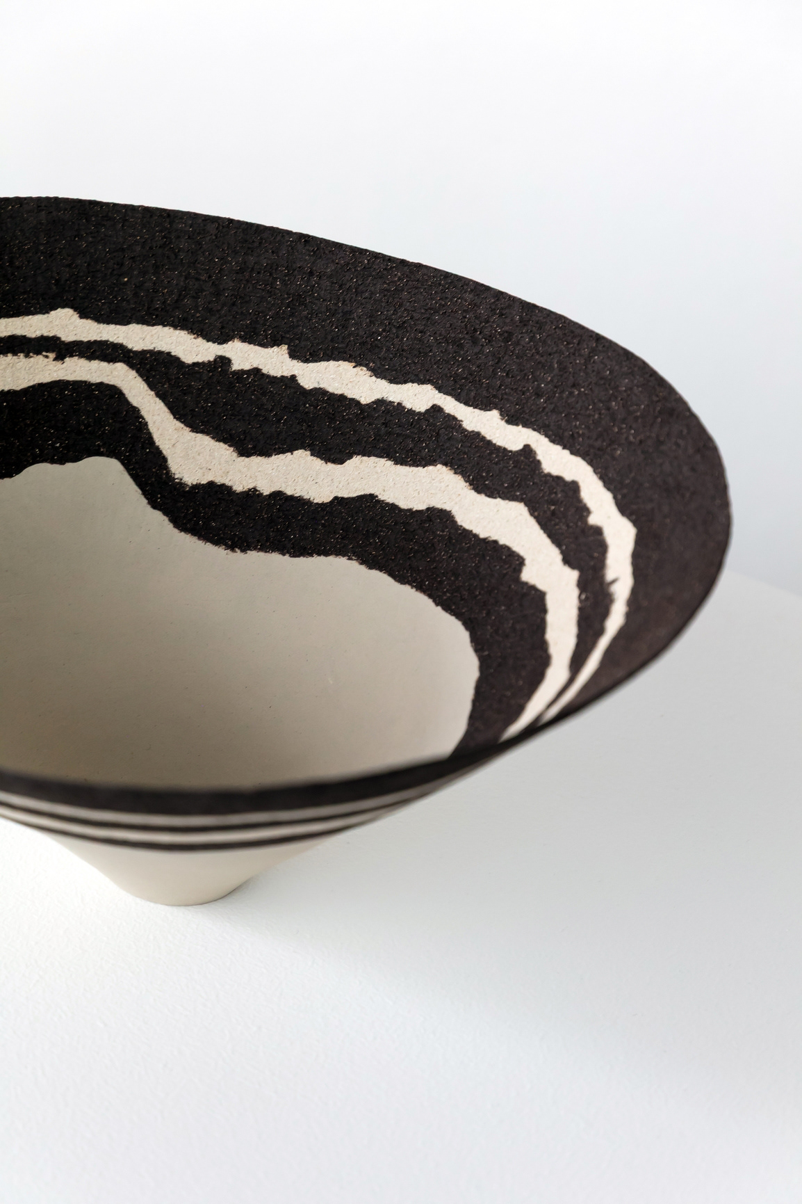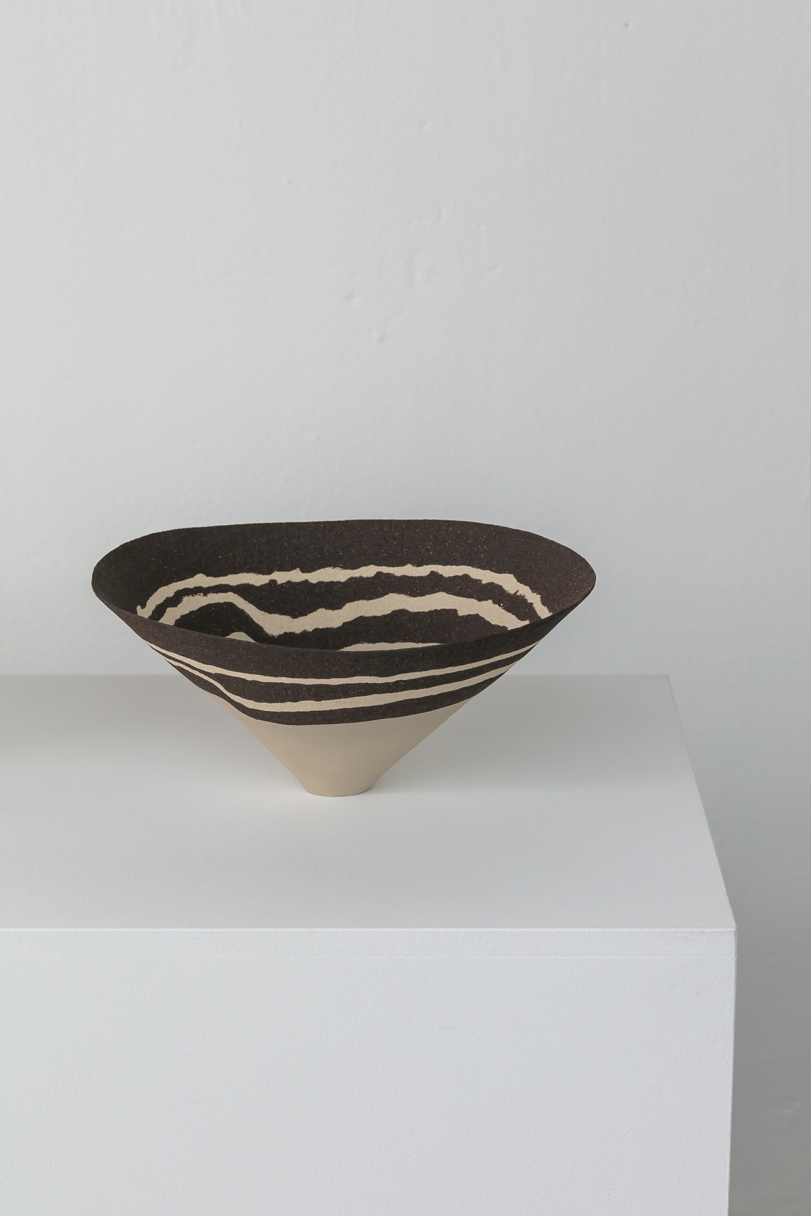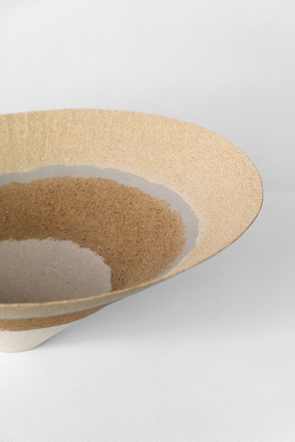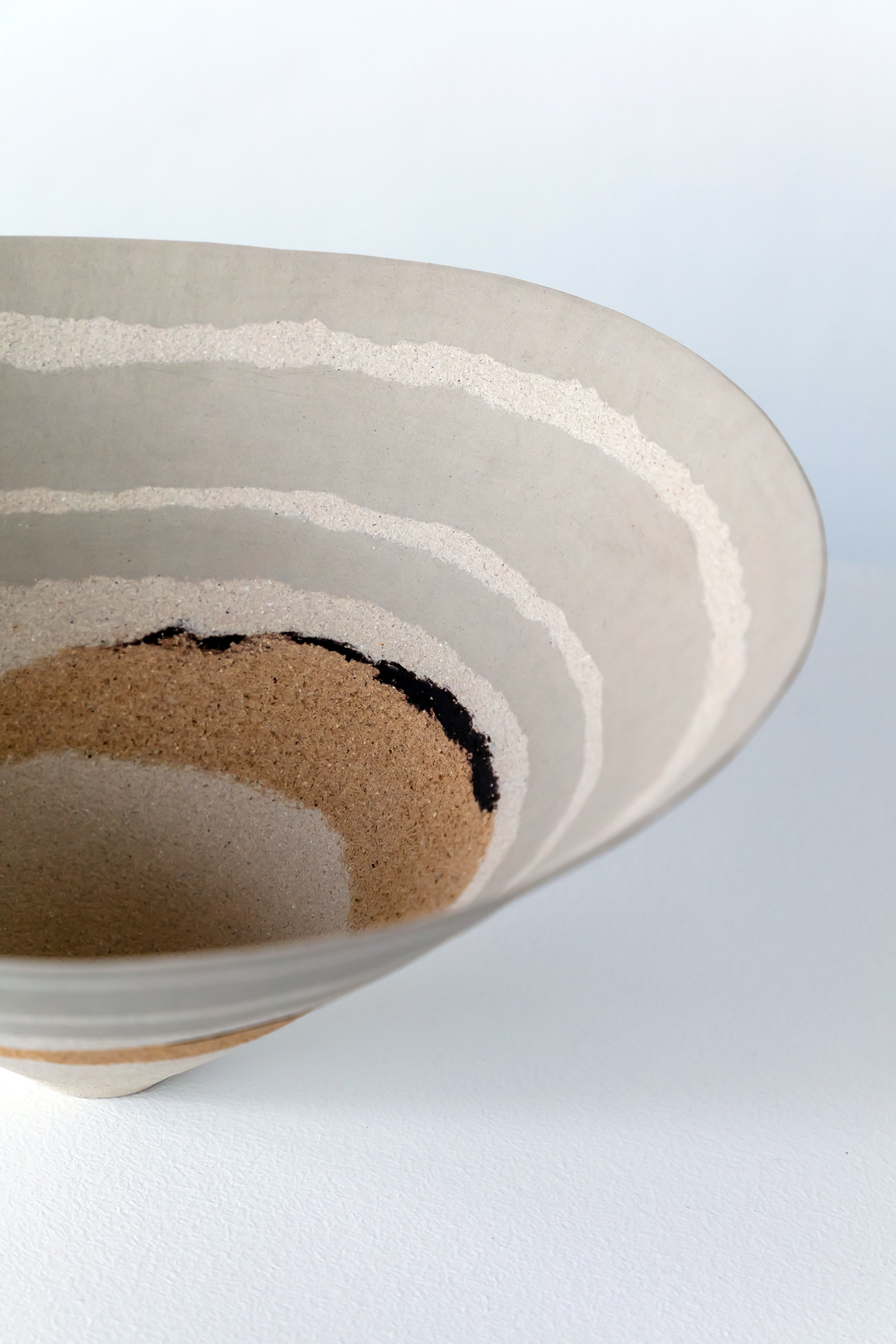 En changeant d’échelle, elle essaie de donner à voir ce qui l’interpelle : les courbes, les strates, les nuances de couleurs, les contrastes. Elle choisit de mettre en avant la terre brute, sans émail ni coloration, jouant sur les textures et les nuances d'argiles. Un travail autour de la matière, sans artifices.