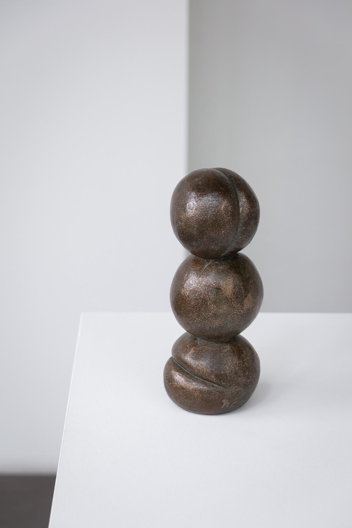 Fruits et légumes deviennent des sujets plastiques, puis les protagonistes d’une histoire réécrite sans cesse : une courge alanguie sur un coussin comme Odalisque parle aussi de sentiments, des couples de fruits s’enlacent ou se tournent le dos, des légumes surdimensionnés sont empilés sur des tiges métalliques dans des totems aériens, dans une recherche de légèreté. Devenue impérissable, cette nature réinventée nous ramène peut-être au Jardin d’Eden.